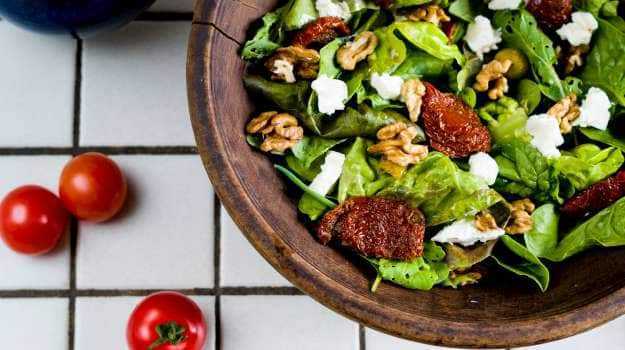 سلطة مع مواد مختلفة ، والمكسرات ، والخل ، والطماطم الكرز ، والخس المقرمش والملفوف الصيني. الخضروات Leafy هي مصدر جيد للألياف ومضادات الأكسدة الأساسية. الألياف تجعلك تشعر بالشبع وتحافظ على الرغبة الشديدة.